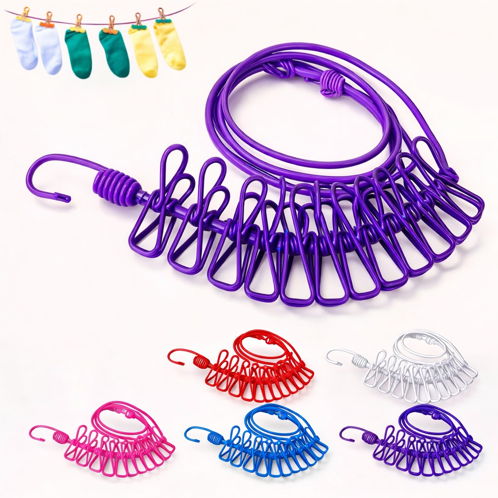 Roop with Clips Socks aur small clothes ko neatly dry karne ka smart solution. Flexible clothesline aur strong clips ke sath space-saving aur easy laundry setup.